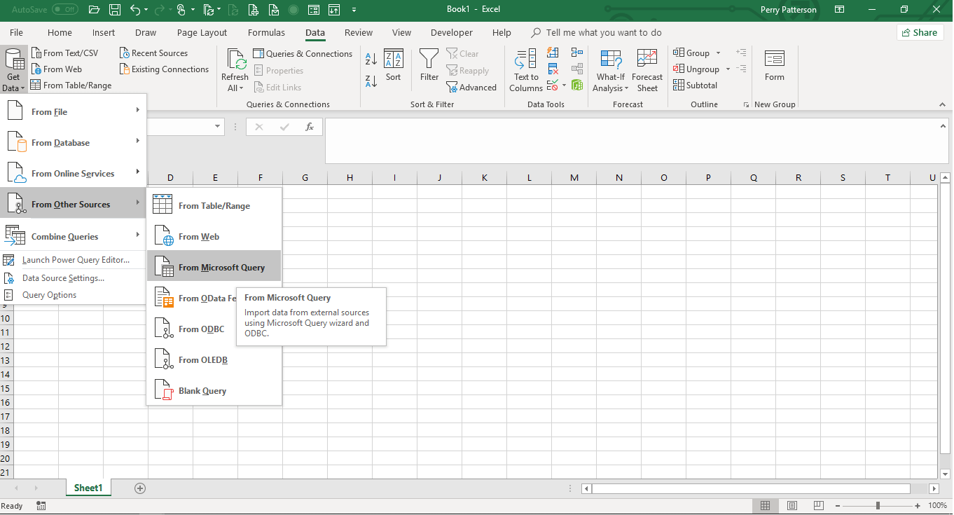 Let’s start with a clean spreadsheet. Open Excel and then click “Get Data”, “From Other Sources”, “From Microsoft Query”. We prefer and always use Microsoft Query to create reports. Occasionally we may need to do some advanced editing of a report, but that should NOT be required for a vast majority of your reports… especially for beginners and even power users.