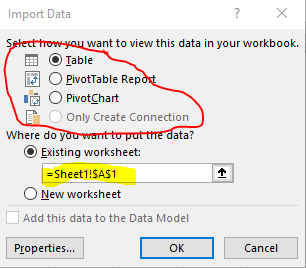 - You need to indicate where to place your table. Normally this is in cell A1 of the current sheet, but you can place this anywhere. For now, the default location is best.