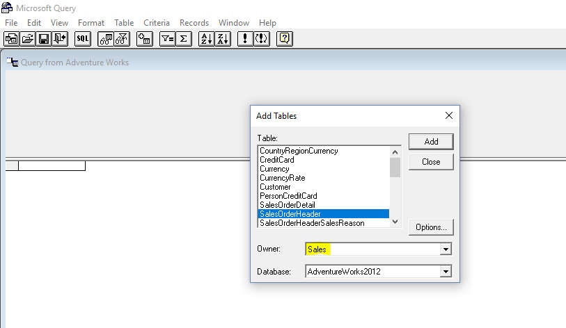 You will see a window within MS Query to “Add Tables”. You can add one or more tables for the report, and we will discuss using multiple tables in in other articles. You also have the ability to select the “owner” of the data. For techies, this is the database “schema”. For non-techies, this is just a grouping of the tables put in place by your database developer. It is just a mechanism for organization!