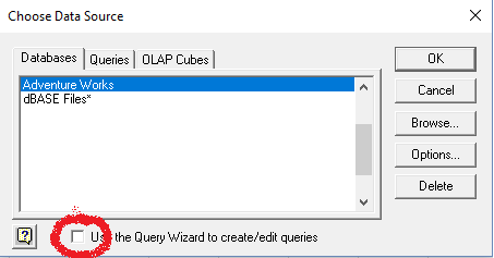 Next you need select your data source. If you followed the steps in the article How to Connect to SQL from Excel, then you should see “Adventure Works” in the list. We strongly recommend you “unclick” the box to “Use the Query Wizard to create/edit queries”. Feel free to check it out and play of desired, but we do not use it here.