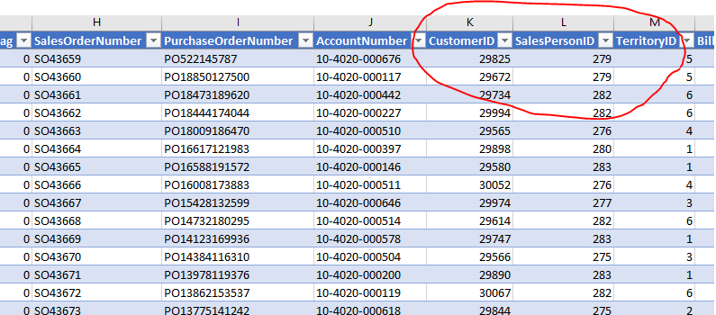 If you look closely at the results when you were able to Create Your First SQL Report in Excel, you see some columns with meaningful, but un-usable data. Columns like Customer ID, SalesPerson ID and TerriitoryID are needed, but who is Customer 29672? If you don’t have all your client numbers memorized (and who does), then you need to have Multiple Tables For Useful Information.