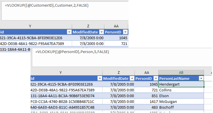 Now that the data is in your your workbook, you can create a couple of vlookups to display the last name of the customer. First you need to create a vlookup for the PersonID then for the PersonLastName. For Person ID, you’ll use the formula “=VLOOKUP([@CustomerID],Customer,2,FALSE)”