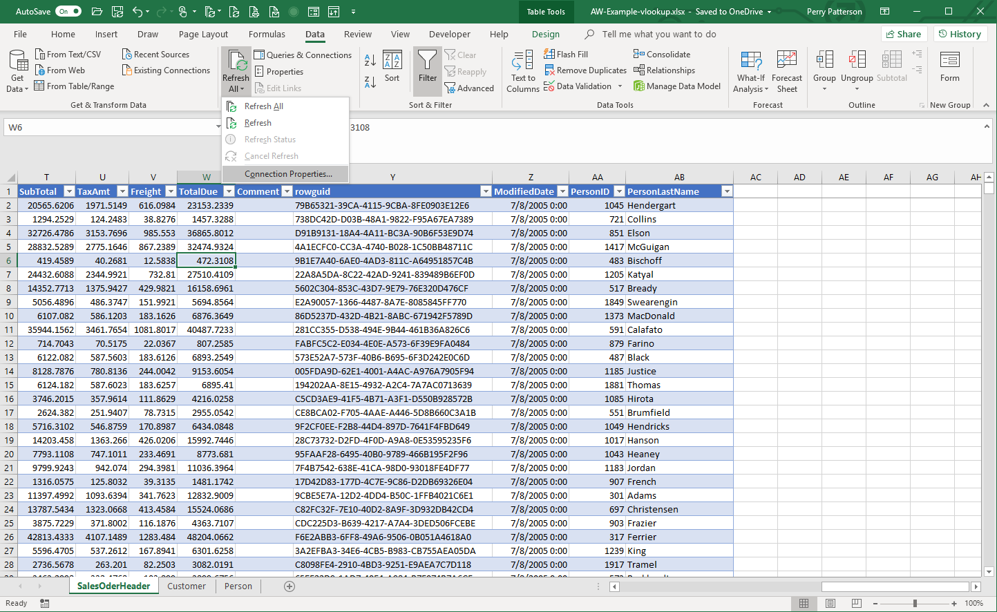 From here, it is just a matter of cleanup. Delete the two vlookup columns you created for PersonID and PersonLastName. You also can delete the tabs you created for Customer and Person as they are not needed anymore. For a bonus, we can get back to the query and a few more tables.