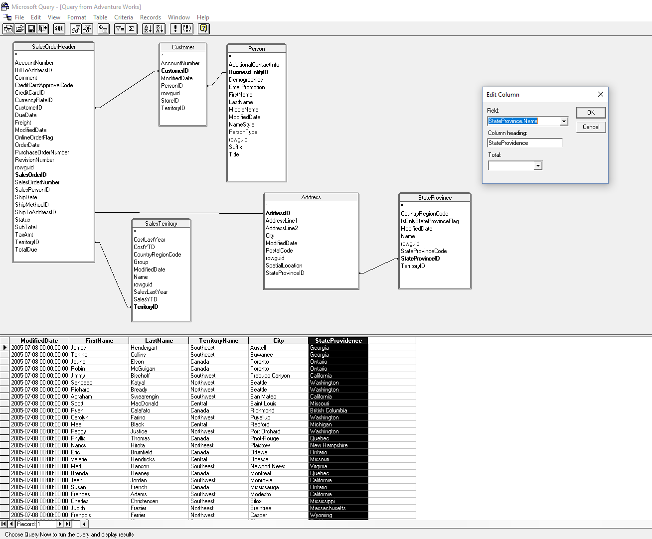 I like to expand the boxes for each table to make them more visible. Next “drag” a link from the “Customer” table from the field “Person ID” to “Business Entity ID”. And then double click FirstName then LastName, and finally the “Query Now” exclamation point icon. You should see the information in the query window that looks like this…